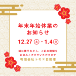2025年12月24日 / 最終更新日時 : 2025年12月24日 トモエ自動車 お知らせ❄️冬季休業のお知らせ❄️ 平素は格別のご愛顧賜り心より御礼申し上げます。 弊社では誠に勝手ながら、本年度の冬季休業を以下の日程で実施させていただきます。 期間中はご不便をおかけいたしますが、何卒ご了承くださいますようお願い申し上げます。 ■冬季休 […]
